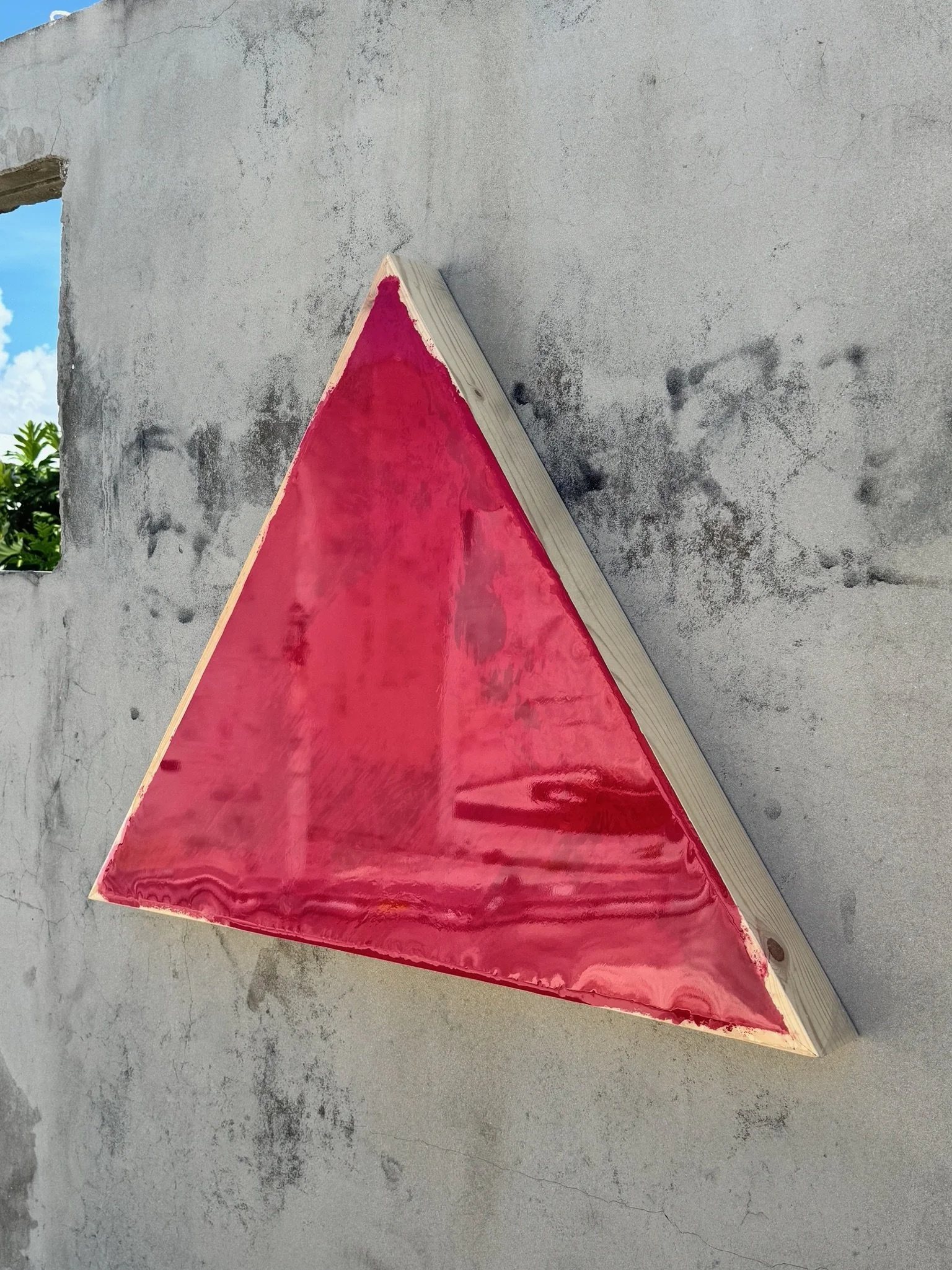 With my own archipelago installation, I transform my ongoing inquiry into memory and identity into a tangible, spatial experience. Instead of presenting a single, unified object, I use the metaphor of a scattered island chain to explore how I believe we construct meaning from isolated elements. This active negotiation with the surrounding architectural environment is a continuous thread in my work. Each island is an autonomous sculpture built on a dialogue of contrasts that I call Engineered Collapse—a methodology rooted in Vivid Erosion and the slow process of Spectral Drift. I achieve this tension by placing rigid geometric forms like the wood-frames and mixed industrial plastic materials in stark juxtaposition with rustic hand-built organic forms and found natural elements. I use this interplay between the machine-made and the ephemeral forms to give the fragments their density and isolation, reflecting the non-linear, fragmented way I process personal and collective histories.