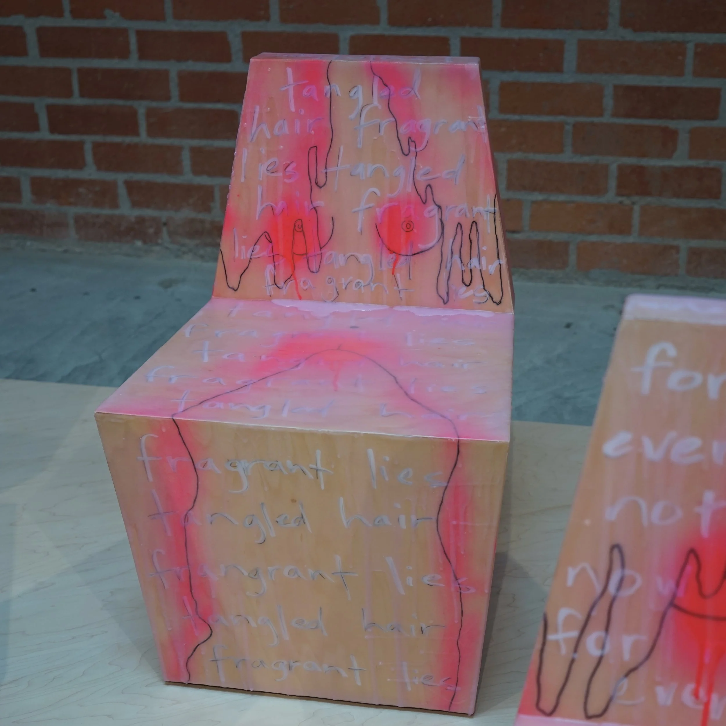 Although making a living as a designer, Smith never lost sight of herself as an artist. Her work is not so much characterized as being either art or furniture as it purposefully and playfully falls between categories. The bright orange two-part, low cylindrical pedestals, or “orange mushrooms” as she calls them are a mix of functional and non-functional forms. Some can serve as stools or night stands, while the proportions of others make them too precarious for use. In either case, their vibrant yet sumptuous surfaces make them first and foremost objects of aesthetic appreciation. Another example includes five, multi-faceted chairs with abject, resin-drenched surfaces through which one can discern writings from Smith’s teen diary and a nude female form rudely scrawled. Is this art in chair form, or a chair subject to expressionist excesses?